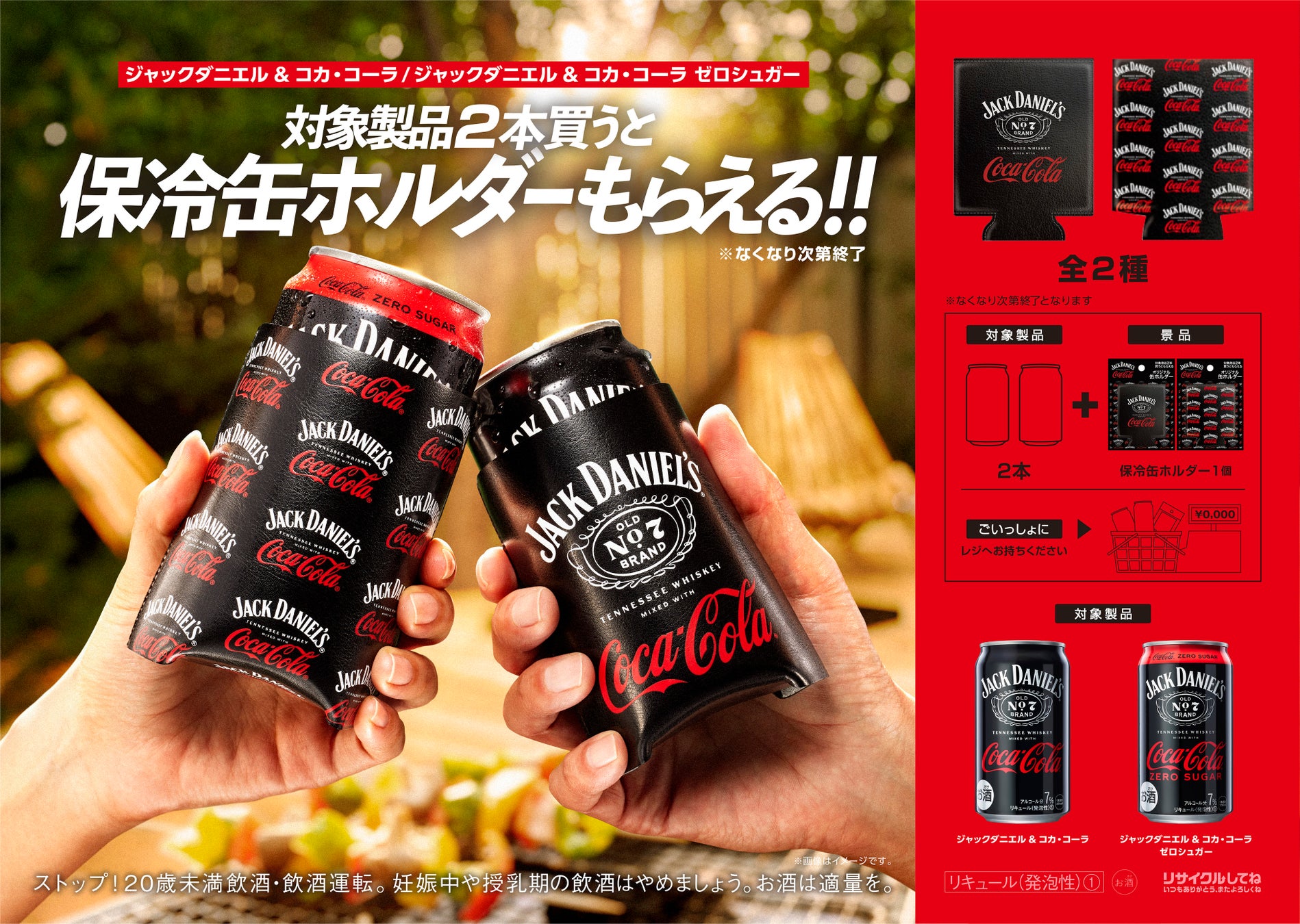 ジャックダニエル&コカ・コーラを2本買うと、保冷缶ホルダーが先着でもらえる。4/1~。