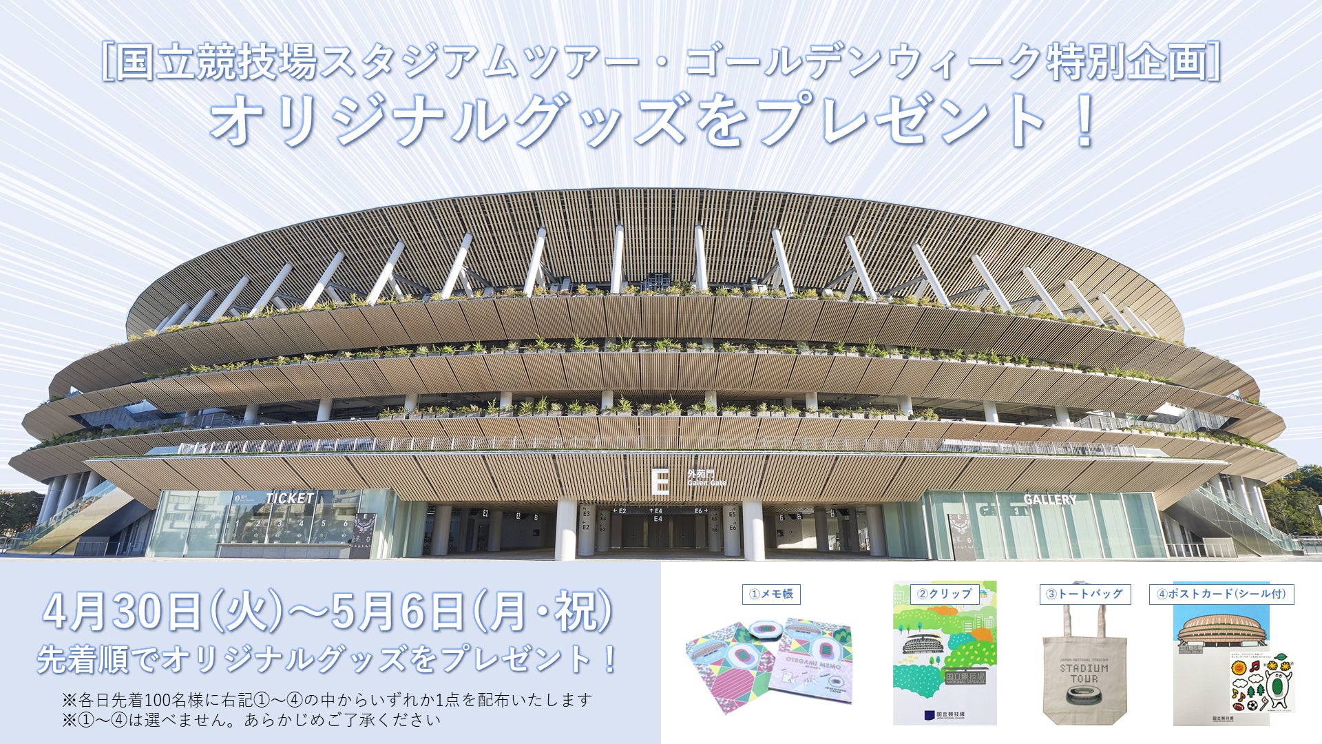 国立競技場スタジアムツアーで毎日先着100名にオリジナルグッズが貰える。4/30~5/6。