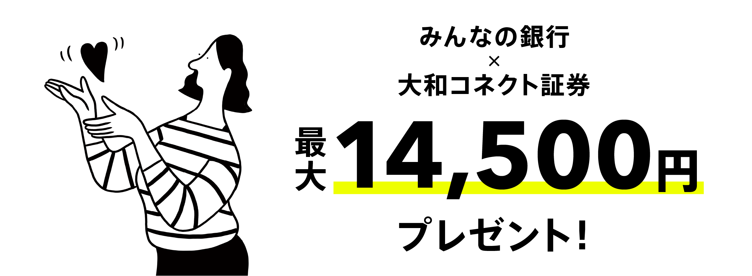 みんなの銀行を経由して大和コネクト証券口座を新規開設で、最大14500円が貰えたり、当たる。~7/17。