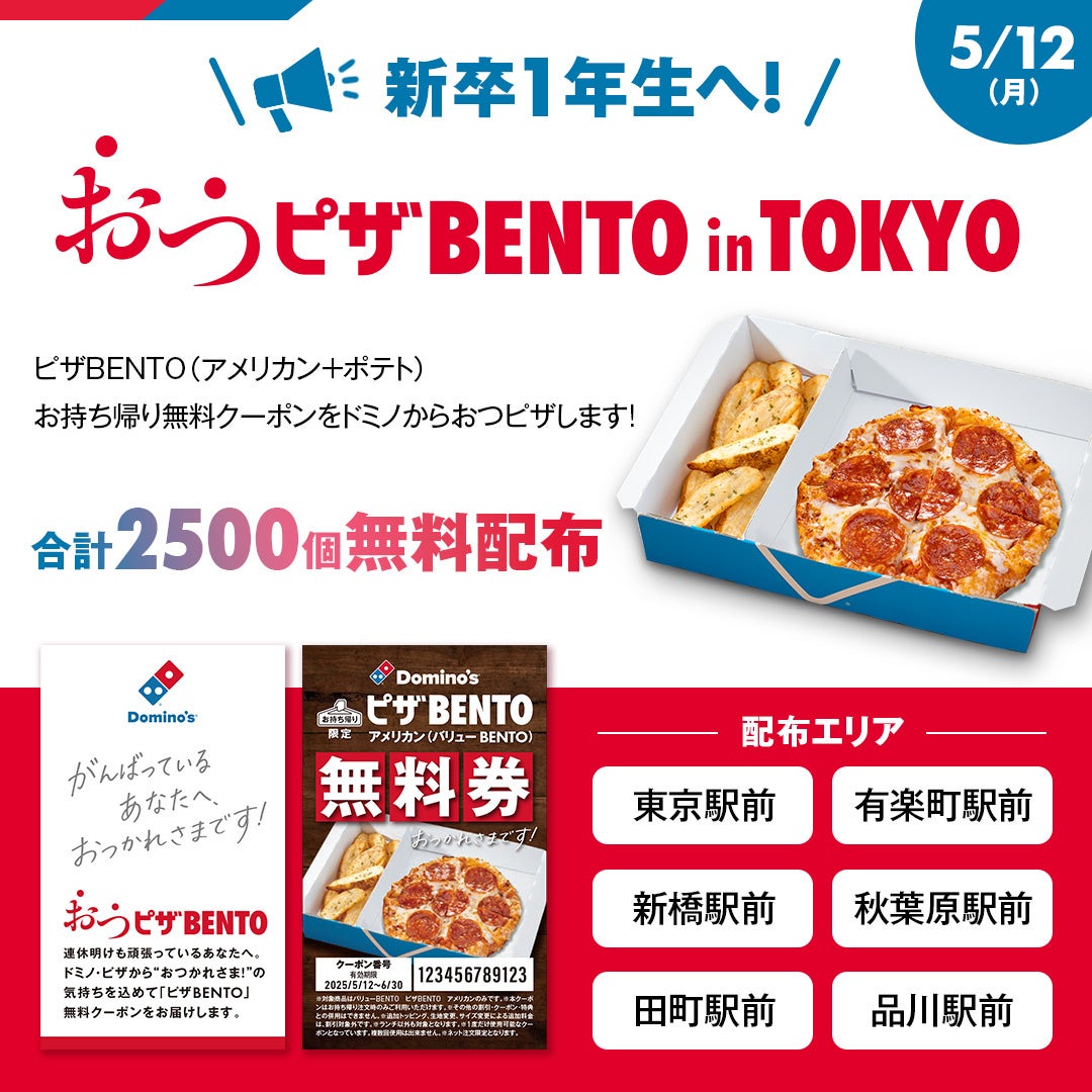 新卒1年目限定、ドミノ・ピザBENTO無料クーポン付き名刺が先着2500名に貰える。東京、品川、新橋、秋葉原、有楽町、田町。5/12 8-18時。