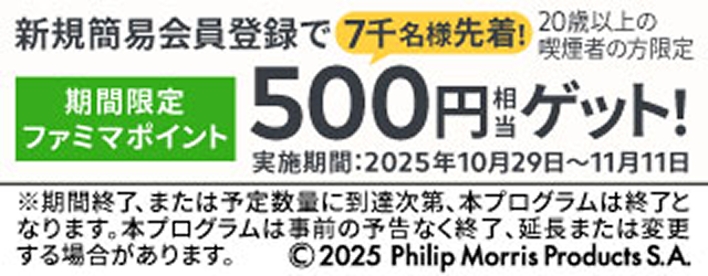 iQOSの新規会員登録で先着7000名に500ファミマポイントが貰える。10/29~11/11。