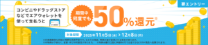 - 1等:期間中の対象決済額の1,000%相当(上限50,000ポイント)…100名