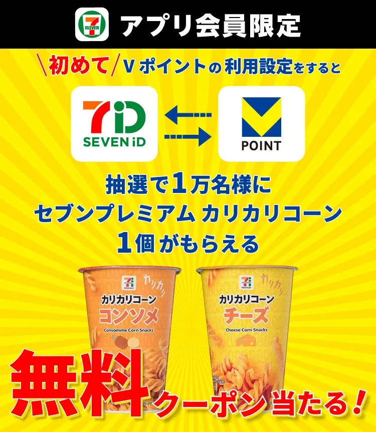 セブン‐イレブンアプリで初めて7iDとVポイントを設定すると、抽選で1万名にセブンプレミアム カリカリコーンが当たります。