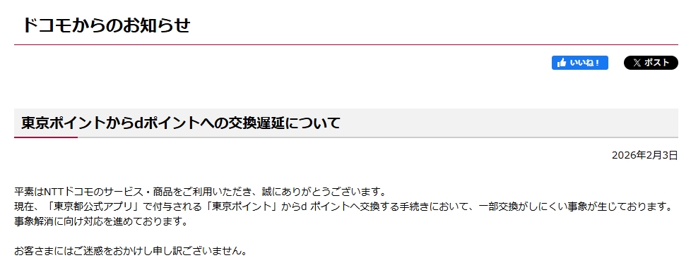 ドコモ側よりお知らせが出ております。東京ポイントからdポイントに交換するルートは、エラーが発生する場合があるそうな。