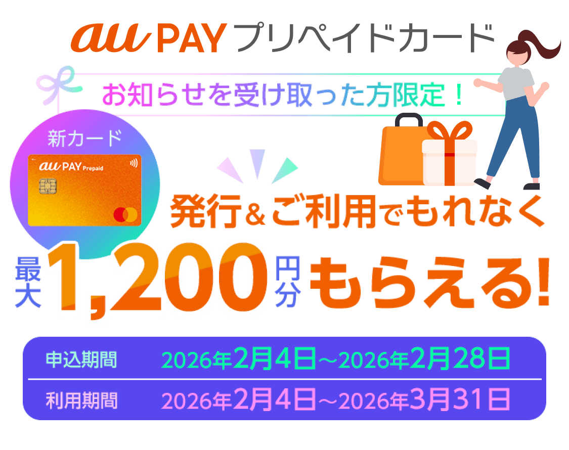 【対象者限定】au PAYプリペイドカード新規発行でau PAY残高が最大1,200円もれなくもらえる。~3/31。