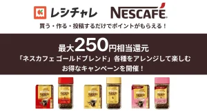 レシチャレでネスカフェゴールドブレンドを買ってレシピを作ると最大250円相当ポイント還元。~12/24。
