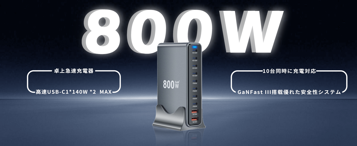 この充電器はUSB-Cポート×8、USB-Aポート×2の構成で、合計800Wのハイパワー出力を実現しています、