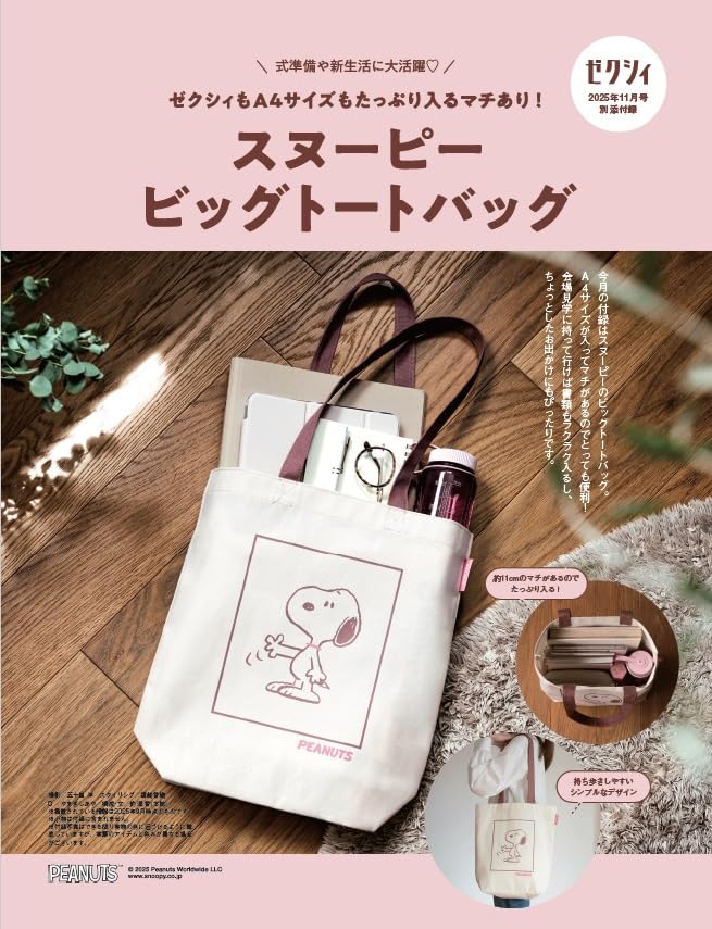 アマゾンでゼクシィ2025年 11月号を買うとスヌーピー ビッグトートバッグが付録でついてくる。