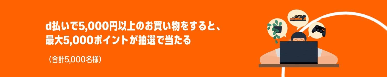 d払いでアマゾンで5,000円以上買い物をすると、抽選で5,000名に50%分(上限5,000ポイント)のdポイント還元が当たる。~12/1。