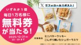 ローソンの「ミニバタークッキー・こんがり焼いたシュガーラスク」が毎日1万名、合計5万名に当たる。12/17~12/21。