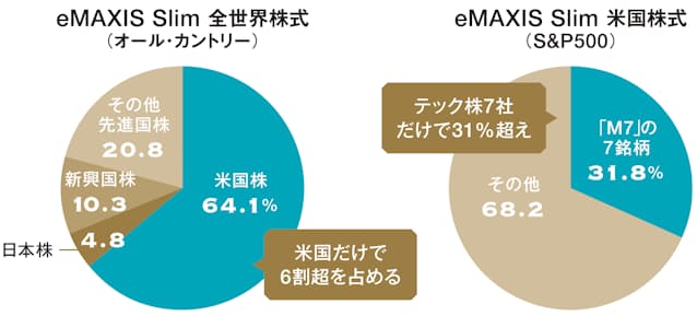 偏りの理由は、2指数が時価総額に応じて比率を決めることだ。値上がりして比率の高まった銘柄も、比率の調整はせずに保有し続ける。過去10年以上、米国株優位の時代が続き、中でも大型テック株の値上がりが突出していたことが現在の比率につながった。