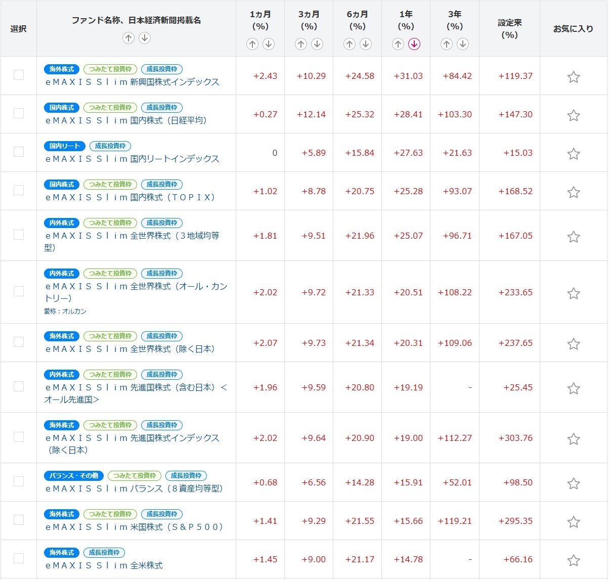 新興国>日本株(日経平均)>日本リート>日本株(TOPIX)>全世界株式(3地域均等型)>オルカン、