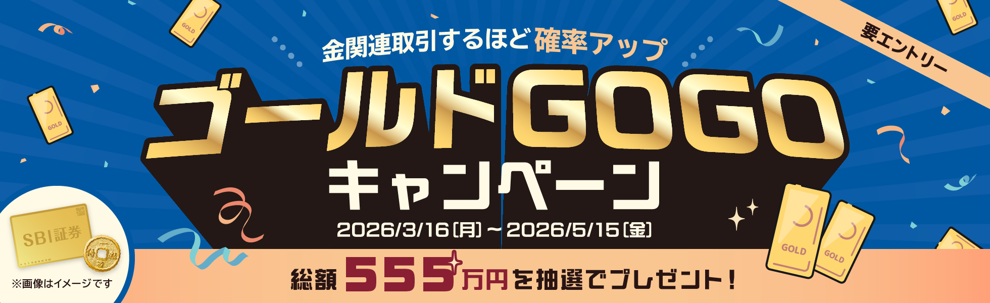 SBI証券でゴールド商品を5,000円以上買うと、純金1gやQUOカード1万円などが抽選3,340名に当たる。~5/15。