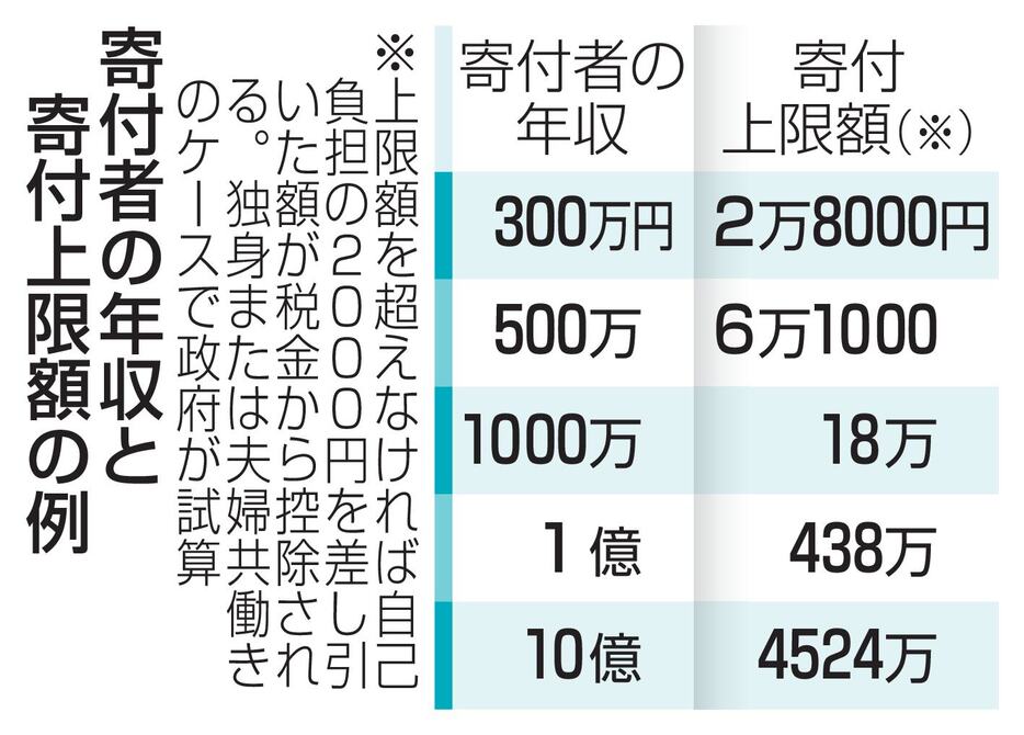 控除の対象となる寄付額の上限は、年収や家族構成などに応じて増える。政府の試算によると、年収300万円の場合は年2万8千円の寄付まで。1千万円では18万円、1億円では438万円、10億円では4524万円までとなっている。