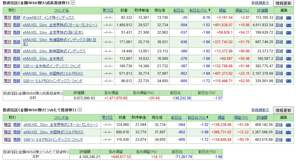前日比だと1.6%程度下落しています。悲しいなぁ。