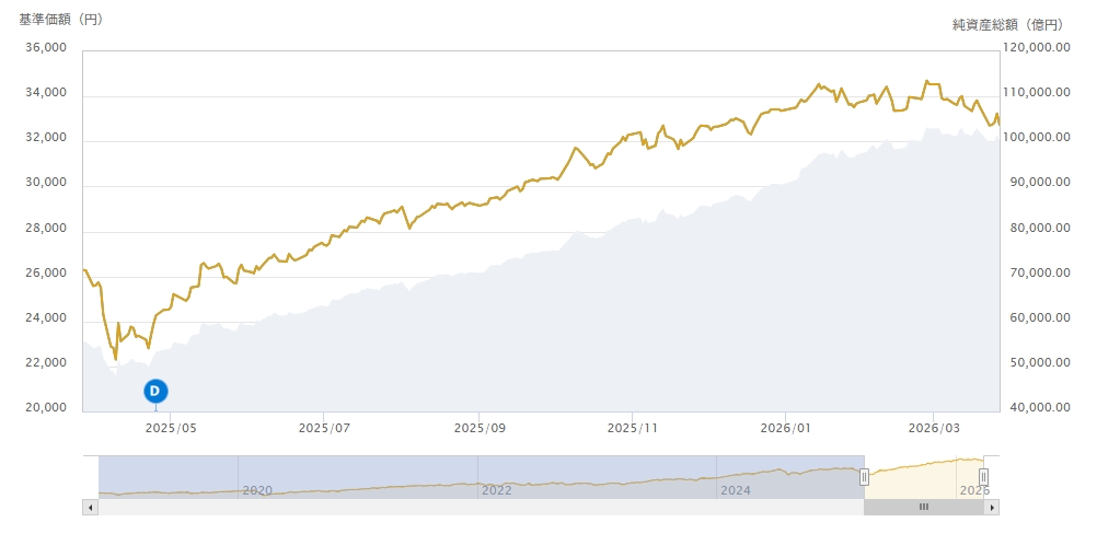 2026/1/5の33,507円に対して、3/27は32,734円と、マイナス2.3%となっています。なんだ、そんなもんか。