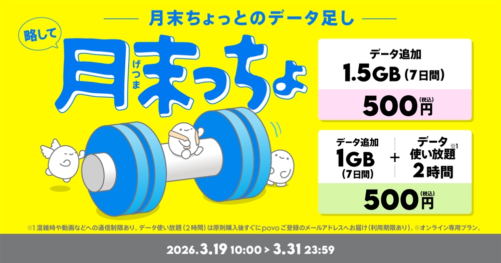 | 【月末っちょ】データ追加1.5GB(7日間) | 500円 | 2026年3月19日10:00~ 2026年3月31日23:59 |