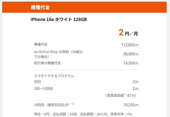 auでiPhone16eが純新規でも実質47円に。U18限定。2/13~。