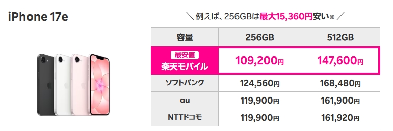 各キャリアでのiPhone17eが発売開始していますが、珍しく楽天モバイルが最安値となります。