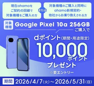 ahamoでMNPじゃなくてもGoogle Pixel 10a 256GBを買うと、10,000dポイントが貰える。~5/31。