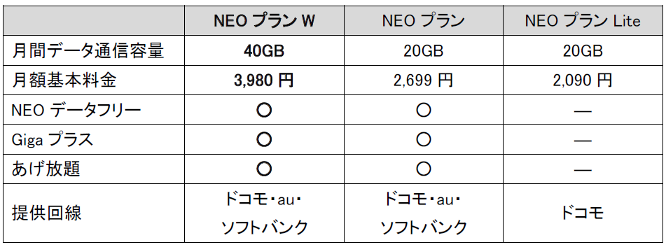 これまで20GBで2699円のNEOプランに加えて、新たに40GBで月額3980円となる、