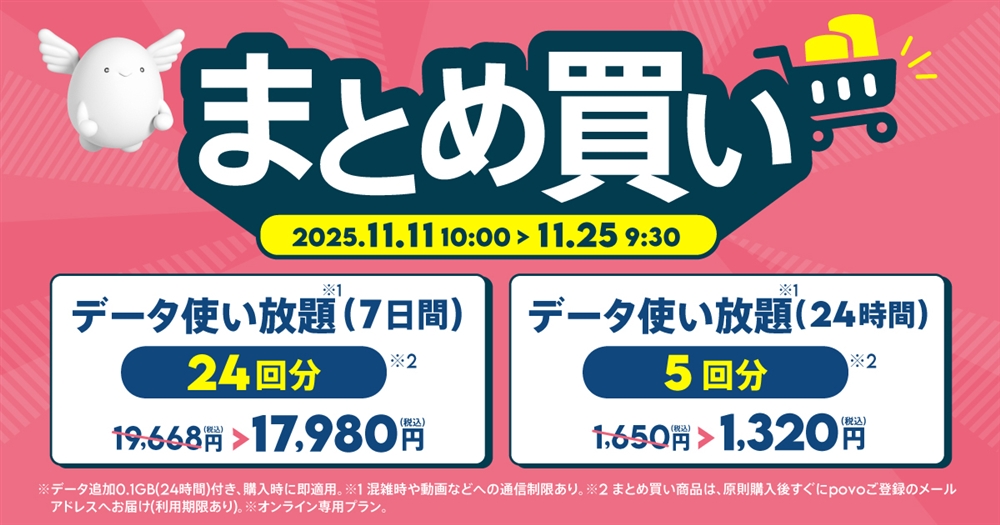 povo2.0で1ヶ月換算で3000円弱でデータが無制限となる「データ使い放題(7日間)24回分」が17980円で販売開始。11/11~11/25。