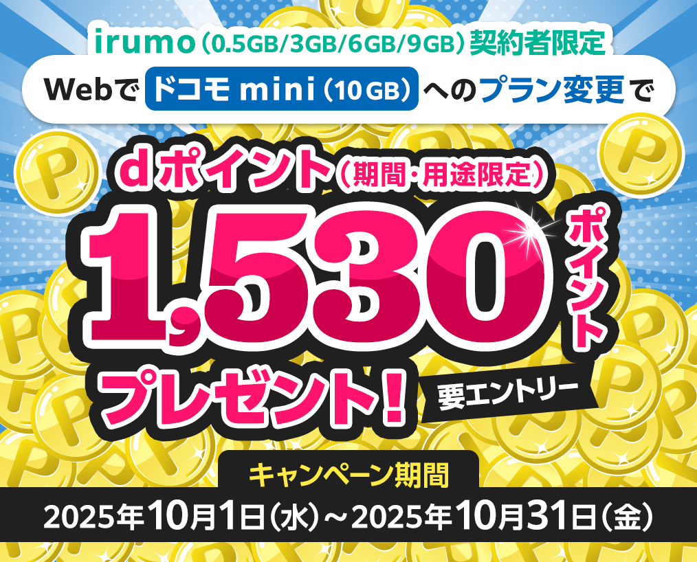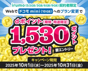 irumo(0.5GB~9GB)契約者がWebでドコモ mini(10GB)にプラン変更すると、dポイント1,530ポイントが貰えます。