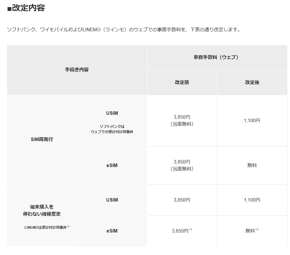 ソフトバンク、ワイモバイルおよびLINEMO(ラインモ)のウェブでの事務手数料を、下表の通り改定します。
