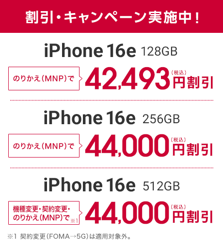 | iPhone 16e 512GB | 機種変更・契約変更・MNPで 44,000円(税込)割引 |