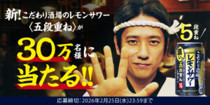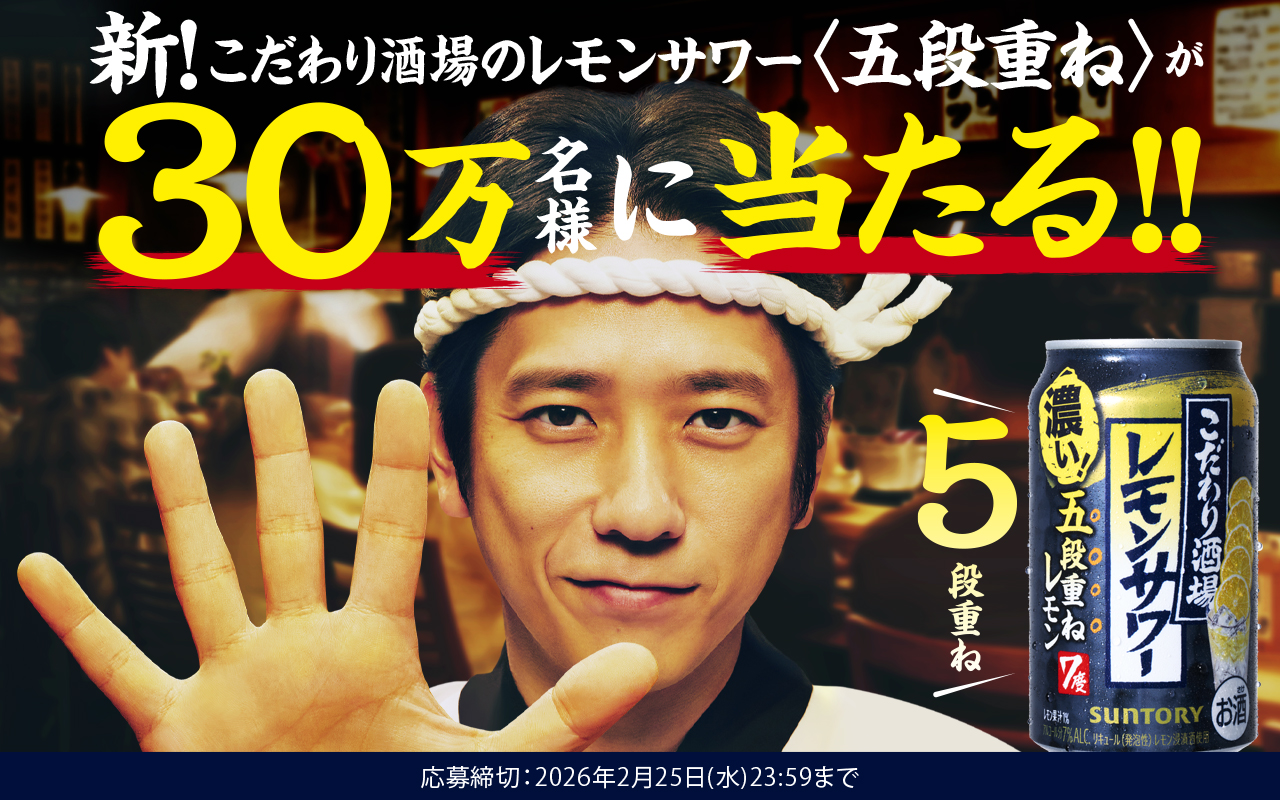 【追加】サントリーこだわり酒場のレモンサワー<五段重ね>が抽選で30万名にその場で当たる。コンビニで引き換え可能。~2/25。
