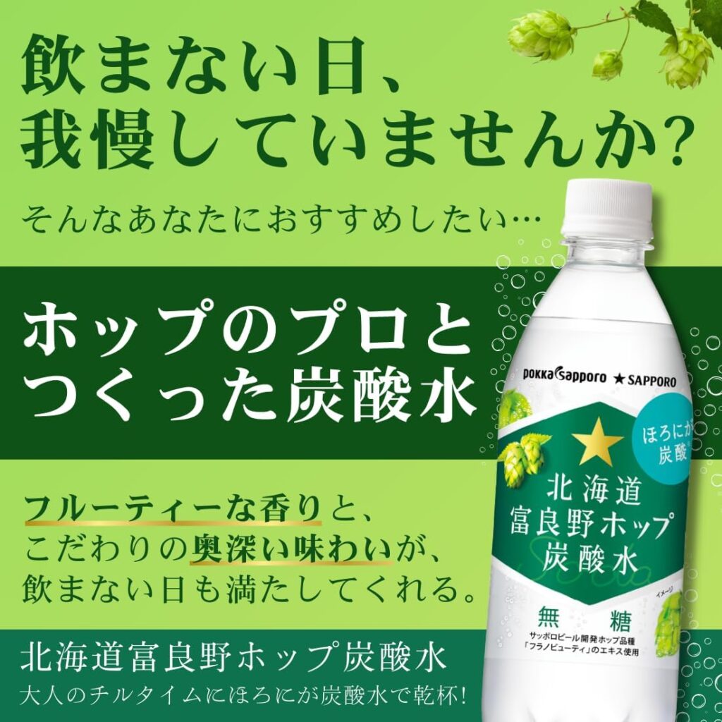 アマゾンでポッカサッポロ 北海道富良野ホップ炭酸水 500ml PET ×24本が2割引。