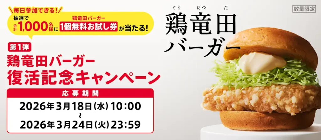 ケンタッキーフライドチキンで「鶏竜田バーガー」が抽選で1000名にその場で当たる。3/18~3/24。