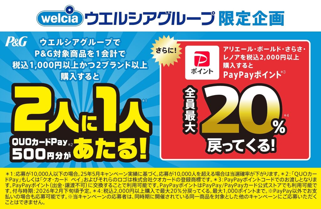 ウエルシアでP&G商品を1000円以上買うと、2人に1人、QUOカードPay500円分が当たる。アリエールなどを買うともれなく20%PayPayバック。~11/30。