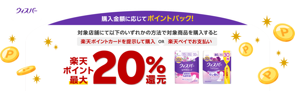 楽天ポイントカード・楽天ペイでウィスパー対象商品を購入すると最大20%分がポイントバック。~12/31。