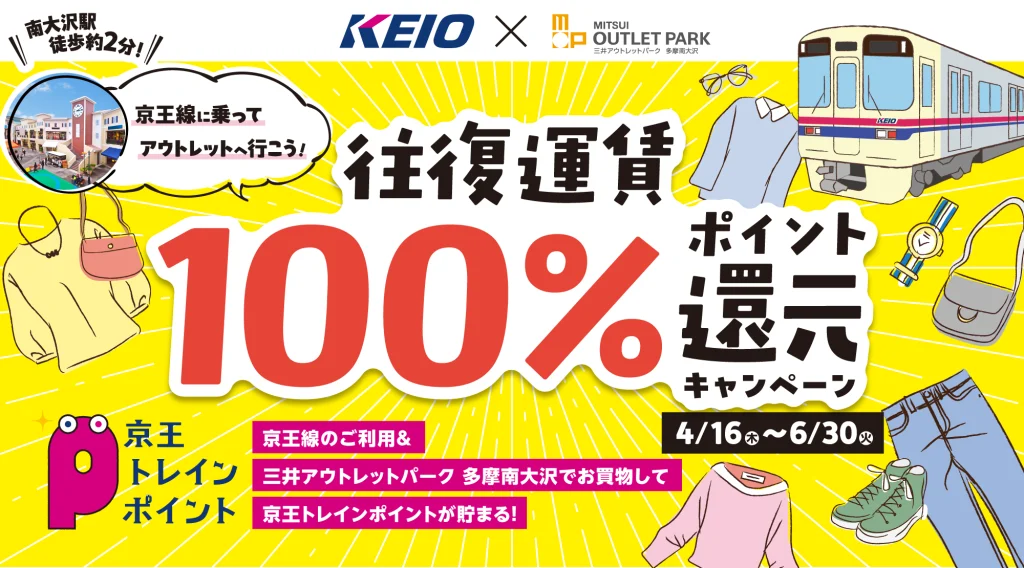 京王線で三井アウトレットパーク多摩南大沢に行って4,000円以上購入すると、往復運賃全額相当ポイントが貰える。何回でも可能。~6/30。