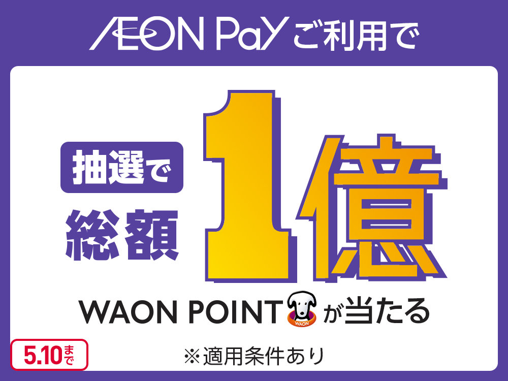AEON Payで5,000円決済で、抽選で10,000名に10,000WAON POINTが当たる。~5/10。