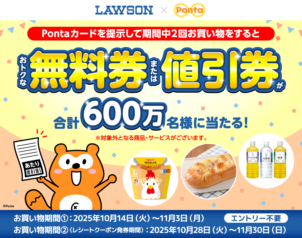 ローソンでPontaカードを提示&2回買い物で、合計600万名にお茶/からあげクン/パンの無料券または値引券が当たる。~12/1。