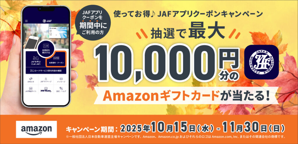 JAFアプリでクーポンを使うと、抽選で最大10,000円分のAmazonギフトカードが当たる。~11/30。