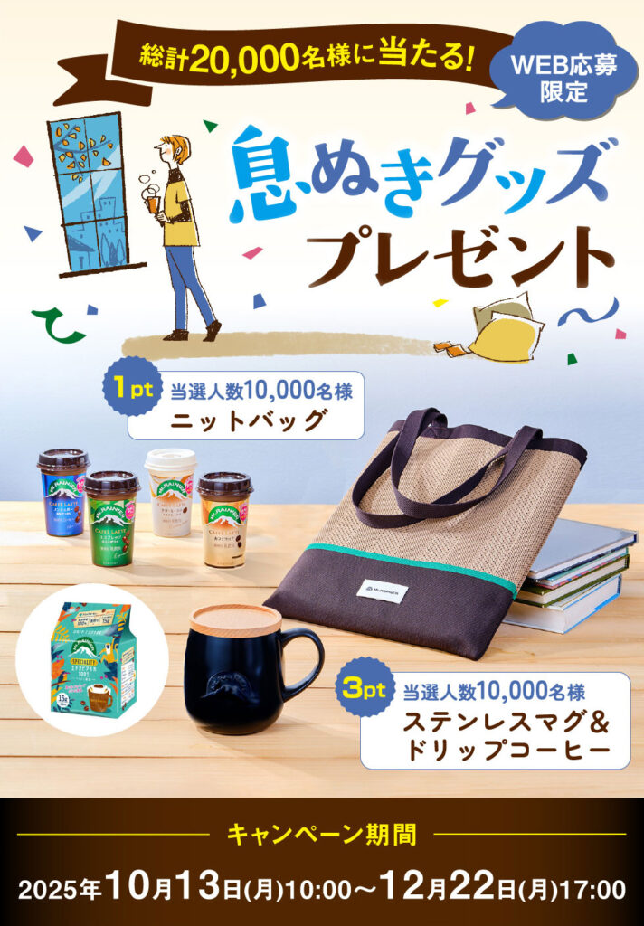 マウントレーニアを買うと、抽選で合計2万名にニットバッグまたはステンレスマグ&ドリップコーヒーが当たる。~12/22。