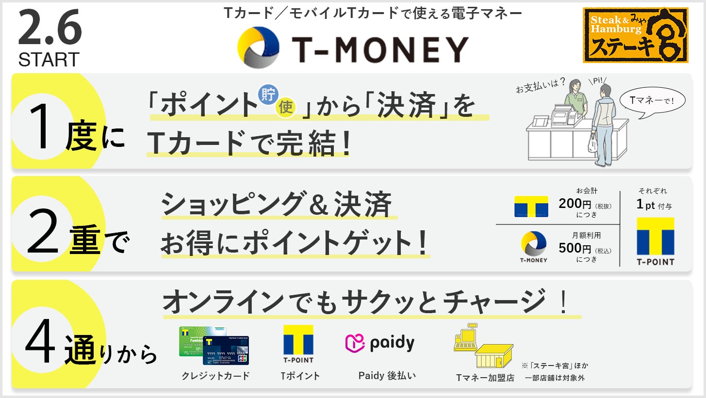 「ステーキ宮」は全国114店舗で2/6より電子マネー「Tマネー」を導入します。