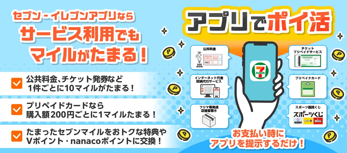 セブン‐イレブンで公共料金やチケット支払い、POSAやスマホプリペイド、Apple Account残高へのチャージでもセブンマイルがたまるアプリでポイ活サービスを開始。2/25~。