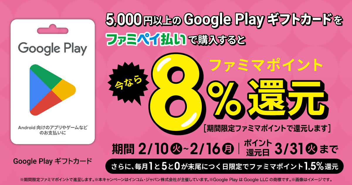ファミリーマートでGooglePlayギフトカード5000円以上購入で8%分のファミポイントが還元。更に、1,5,0が末尾につく日は+1.5%。~2/16。