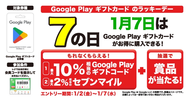 セブン‐イレブンアプリで1月7日の購入で、累計購入金額に応じたGoogle Play ギフトコードとセブンマイルが