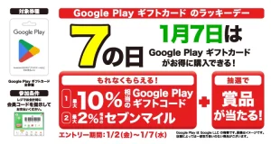 セブンイレブンで7の日限定、GooglePlayギフトコードが10%、2%セブンマイル還元、更に抽選でJTBトラベルギフトやQUOカードPayが当たる。