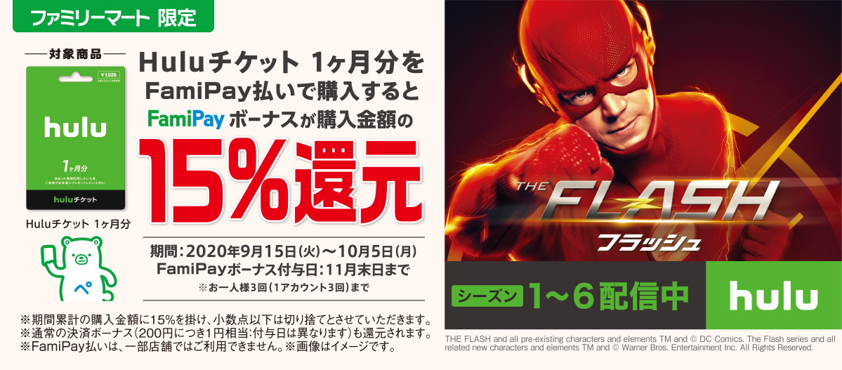 ファミリーマートでHuluの1ヶ月分チケットを買うとFamiPay15%還元中。~10/5。