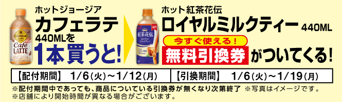 ホットジョージアカフェラテを買うとホット紅茶花伝『ロイヤルミルクティー440ml』がもらえる~1/12。