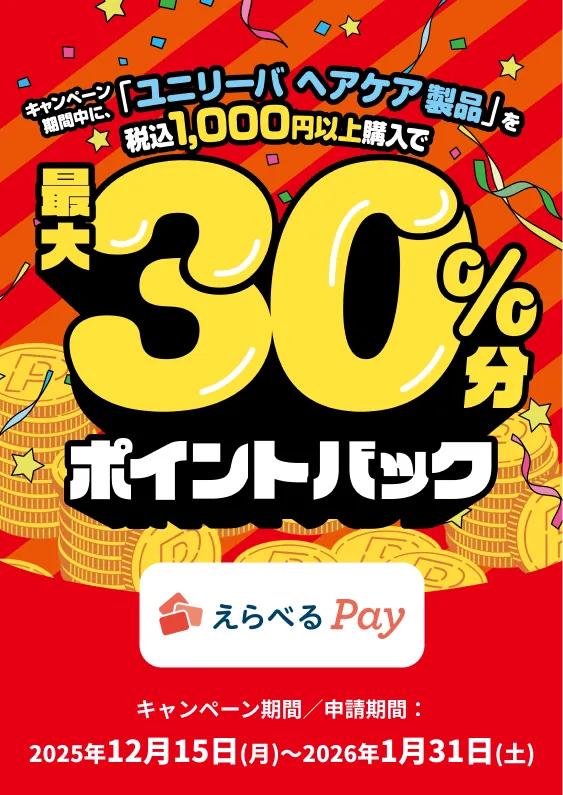 ユニリーバを1000円以上買うと最大30%分のえらべるPayが貰える。~2026/1/31。