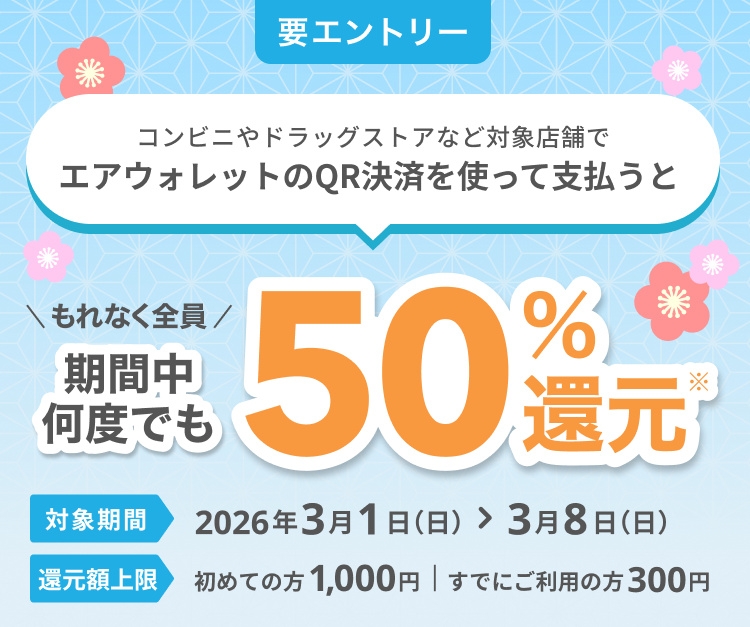 キャッシュレス決済「エアウォレット」で買い物をすると50%還元。無印良品やダイコクドラッグなどが対象。3/1~3/8。