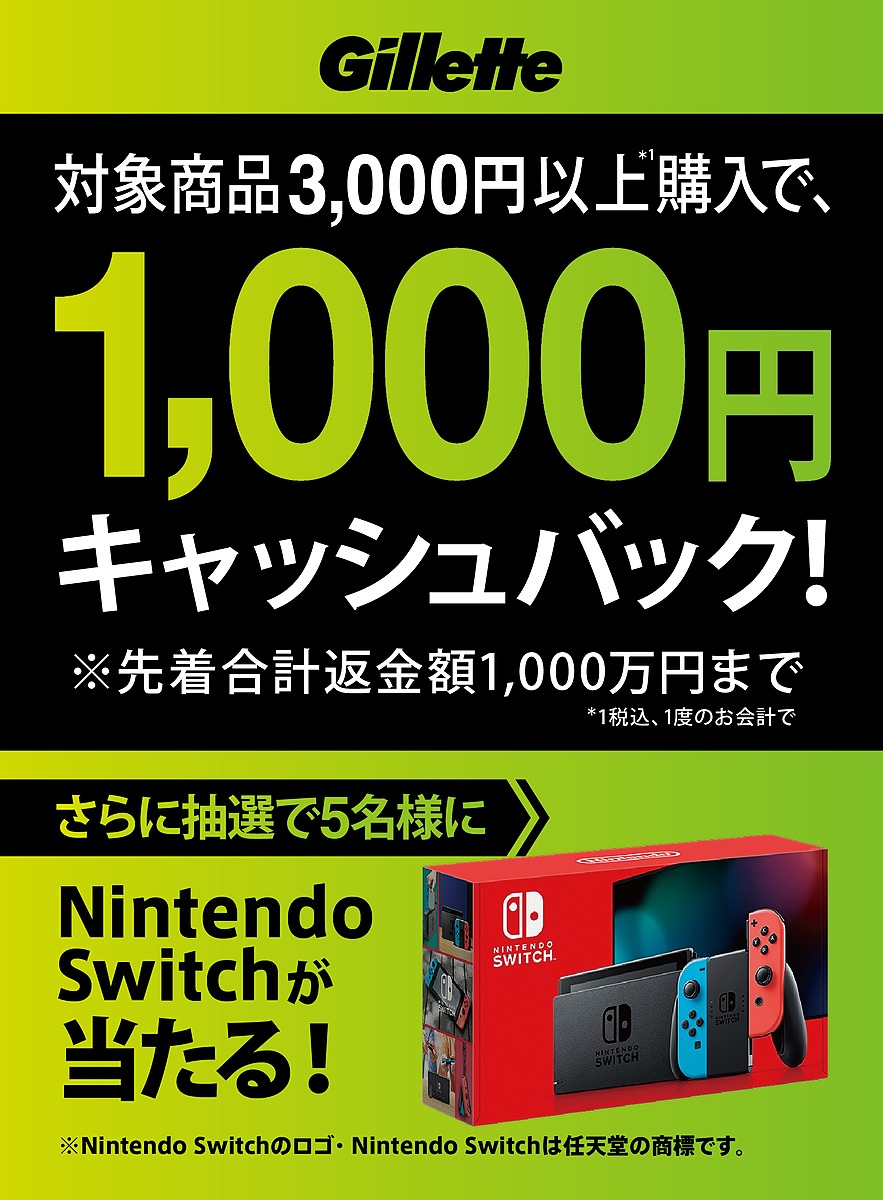 ひげそりジレットを3000円以上購入すると1000円キャッシュバック。~5/31。
