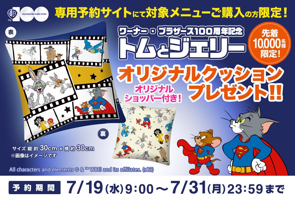 ほっともっとで3000円以上の弁当を買うと、「ワーナー・ブラザース100周年記念トムとジェリーオリジナルクッション」が先着1万名に貰える。7/19〜7/31。